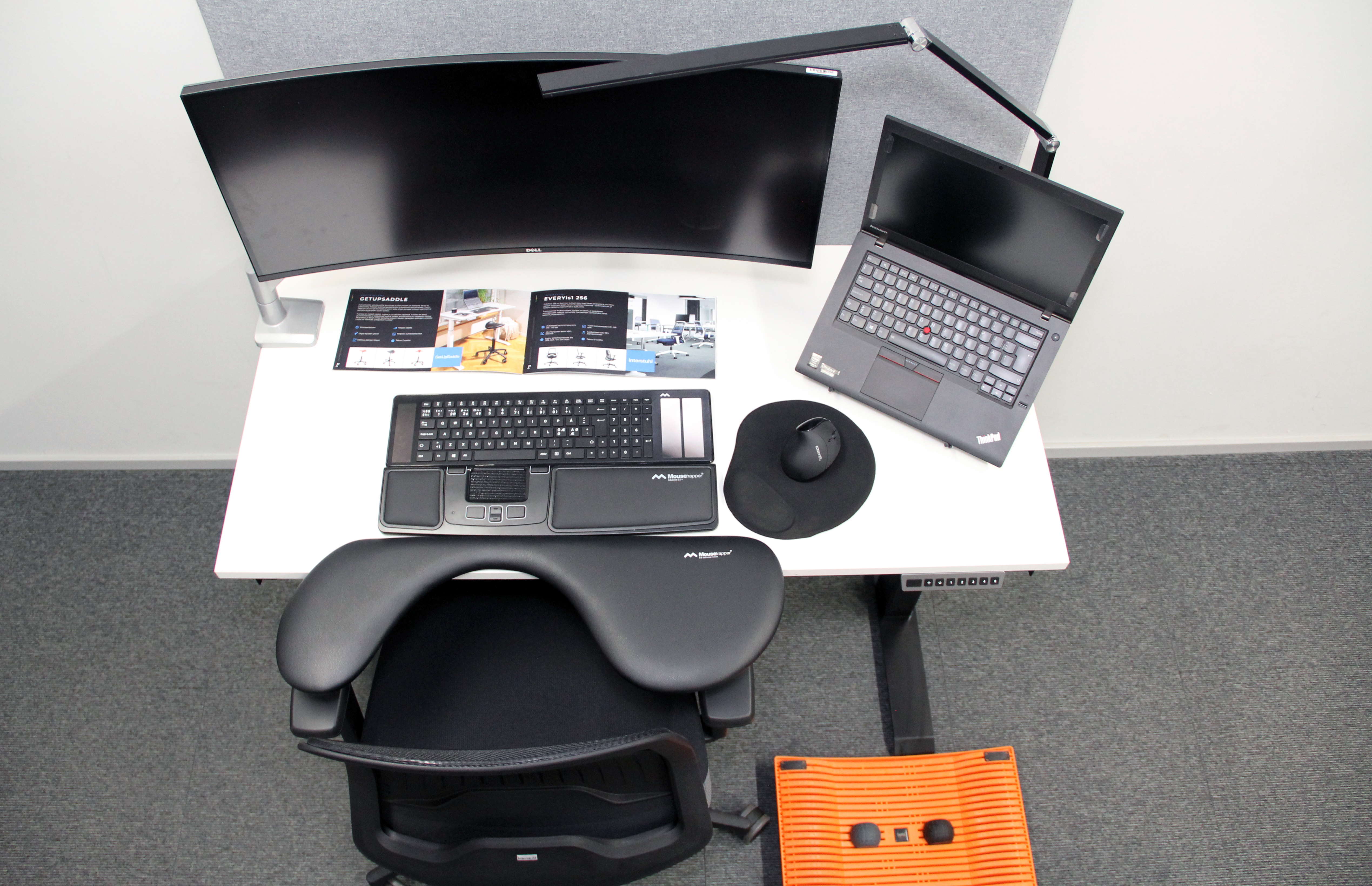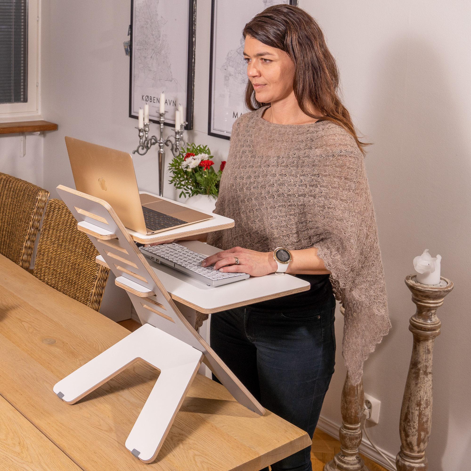 Se till att skärmen är i rätt höjd. Du kan använda skärmarmen för en separat skärm. Du kan använda GetUpDesks ljusställstativ med den bärbara datorn.