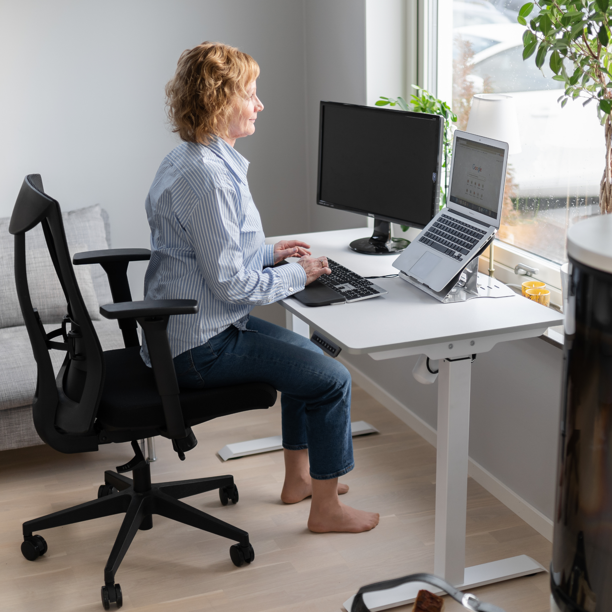 Om du jobbar mycket hemifrån är det värt att notera om du har en bra arbetsställning. God ergonomi kan förbättra välbefinnandet och förebygga besvär i ryggen, nacken och hela kroppen, samt minska sjukfrånvaro. Hemmiljön definierar ramarna för vilken typ av ergonomiska lösningar som kan implementeras. Hos ErgoFinland kan du hitta ett brett utbud av ergonomiska lösningar och verktyg för olika behov och utrymmen – för ett litet hem och för att skräddarsy stora arbetsrum och kontor. Våra experter hjälper gärna till att hitta de mest lämpliga lösningarna för allas individuella behov.